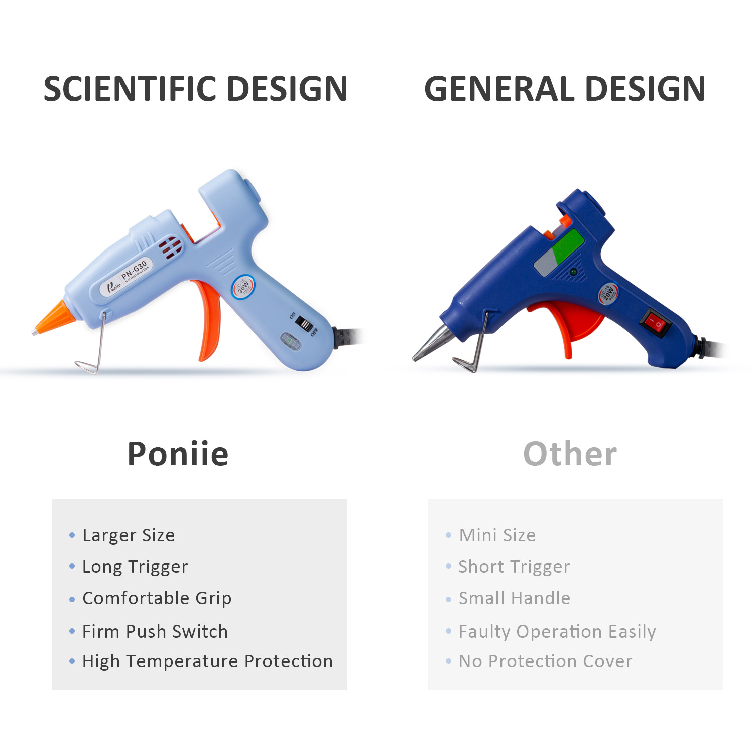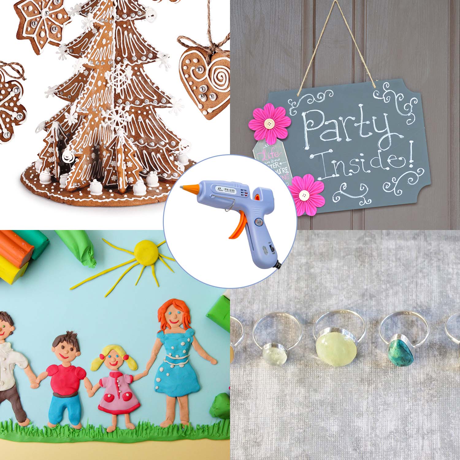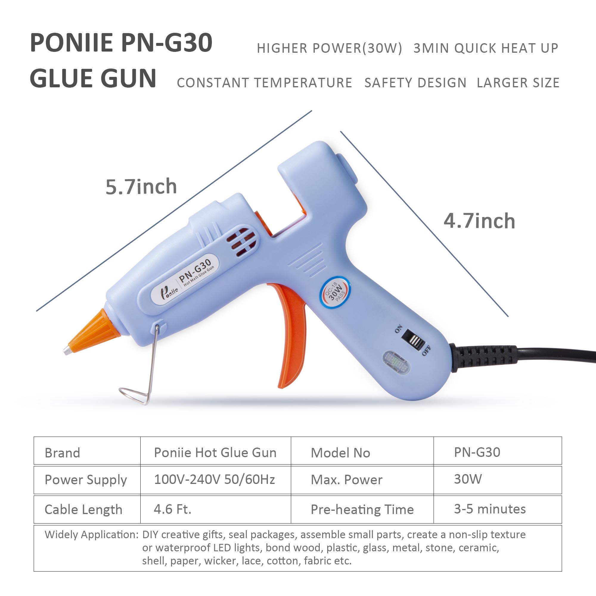 PN-G30 Melt Glue Gun Kit is an easy use DIY tool not only in crafts making but also in daily repairs. The hot melt glue can be applied on many sorts of materials. Such as wood, plastic, glass, metal, stone, ceramic, shell, brick, paper, wicker, lace, cotton, fabric etc.