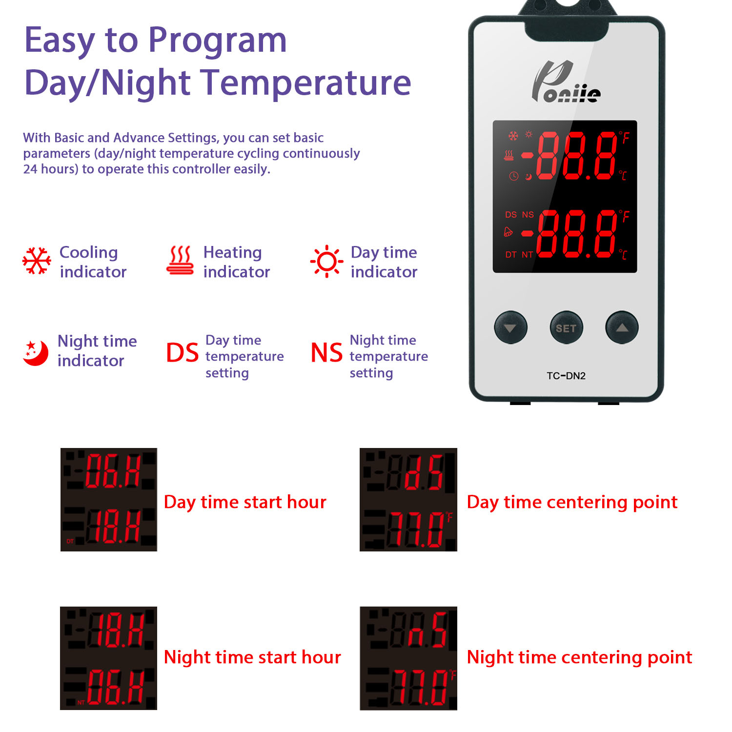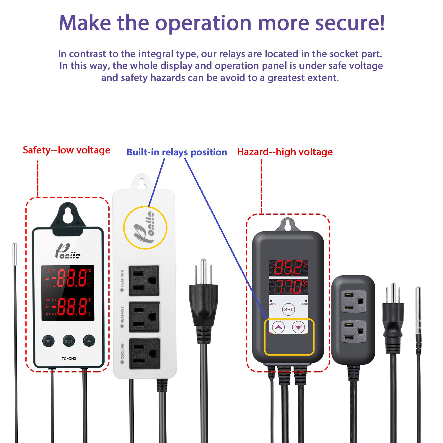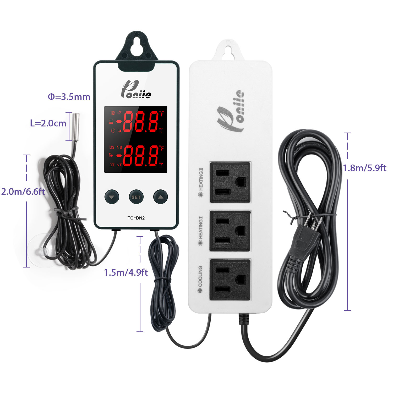 Poniie's TC-DN2 thermostat is an easy-to-use, safe and reliable dual relay output controller, which is your perfect solution to providing constant temperature as over temperature protection or automatic temperature control system for various tasks. Such as Reptiles Culture, Sous-vide, Home-brew & Fermentation, Carboy, Kegerator, Breeding and Germination, etc.